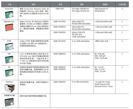 用户可升级模块化设计,可拓展整个系统的检测能力,实现时间分辨荧光检测、HTRF 检测、 AlphaScreen、细胞成像、配有注射器的快速动力学检测和 Western Blot 检测等。