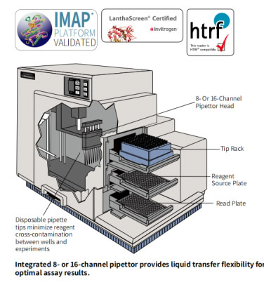 内置 8 通道移液器或 16 通道移液器可将源板中 96 个或 384 个不同孔中的试剂转移至读板,从而提高测定灵活性。